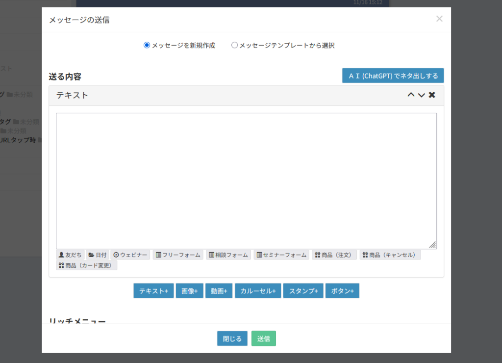 上のアイコンを選択すると追加機能設定用の小ウィンドウが開きます。「リッチメニュー」や「ボタン」のメッセージ送信で利用する小ウィンドウと同じものです。