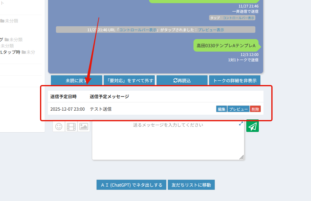 予約送信を設定すると、ここに送信待機中のメッセージが表示されます。