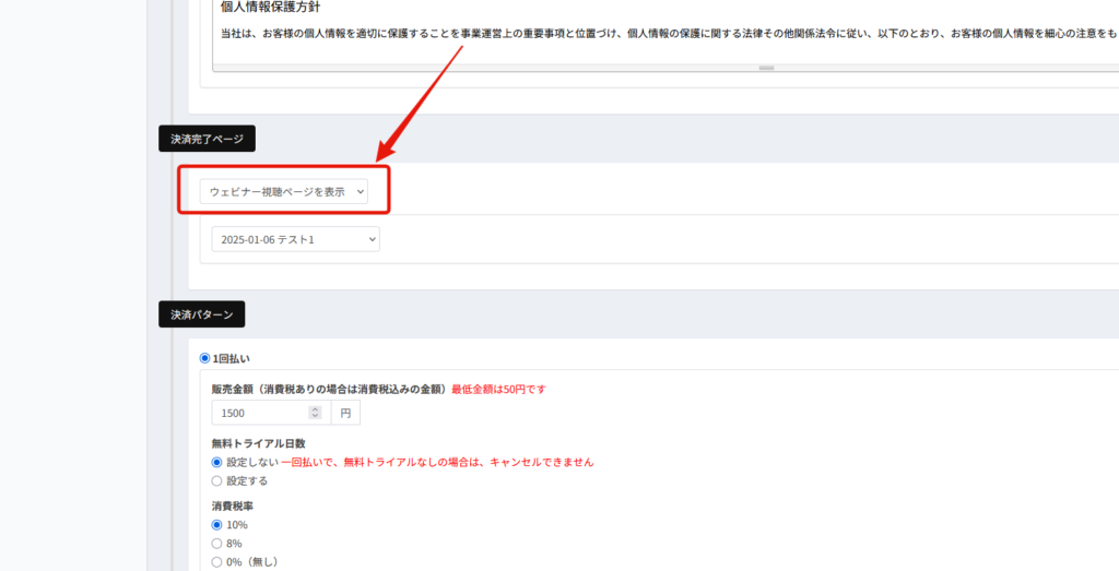 これまで、「商品」の「決済完了ページ」は「外部で作ったページを使う」か「かんたんページで作る」かの2種類でしたが、この度、その2つに加えて「ウェビナー視聴ページ」「別の商品販売ページ」「各種フォームページ」も選べるようになりました。